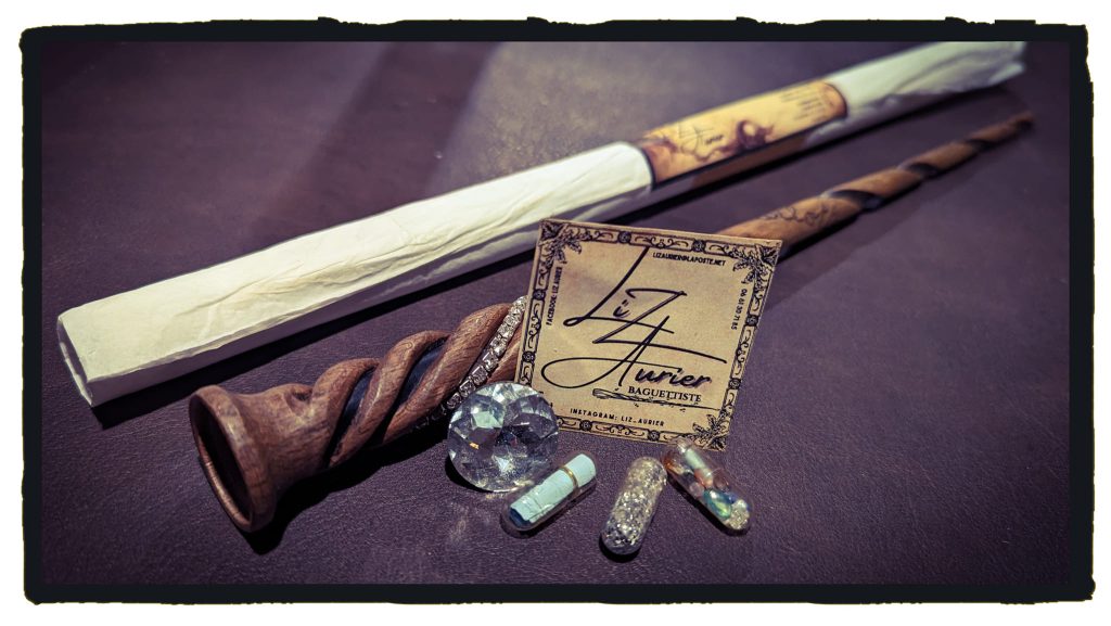 « Que ce soit pour une baguette de métier, de croyance ou de pop culture, il me faut d’abord connaître le caractère de la personne. Pour une personne fougueuse, un aspect plus courbe que pour une personne discrète et réservée. » Effectivement, ce n’est pas la baguette qui choisit son sorcier, mais une pièce unique qui est réalisée avec et pour le commanditaire. Ceux qui nous connaissent sauront que ce n’est pas uniquement l’esthétique merveilleuse de ses pièces qui nous motive à vous présenter cette artiste. Ce que Liz propose, c’est de glisser un « vous savez quoi », qui vous est propre, à la fois mystère et intention. C’est ce cœur qui saura donner à la future baguette son impact personnel.